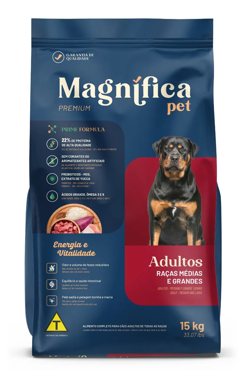 A Ração Magnífica Pet Premium para Cães Adultos de Médio e Grande Porte é um alimento completo, seco e balanceado, desenvolvido para suprir as necessidades de cães com estrutura corporal mais robusta.